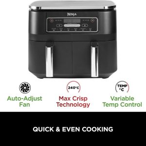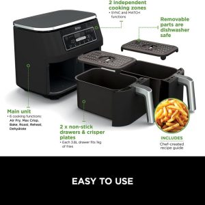 - INCLUDES: Ninja Air Fryer (UK Plug), 2x Non-stick, dishwasher-safe 3.8L Drawers (7.6L total capacity) & Crisper Plates. Chef-Created Recipe Guide. Weight: 8.2kg. Colour: Black.