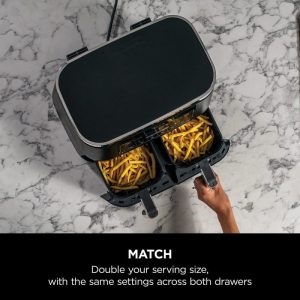 - 2 INDEPENDENT COOKING ZONES: Cook 2 foods, 2 ways, both ready at the same time. Use different functions, times and temps in each drawer to create complete meals in one appliance, or cater to 2 tastes.