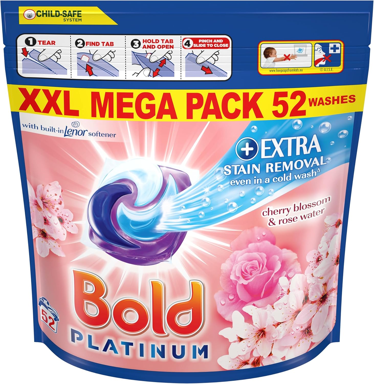 Bold Platinum PODS® Washing Liquid Laundry Detergent Capsules 104 Washes (52×2), Cherry Blossom & Rose Water, Extra Stain Femoval, With Built-In Lenor Softener
