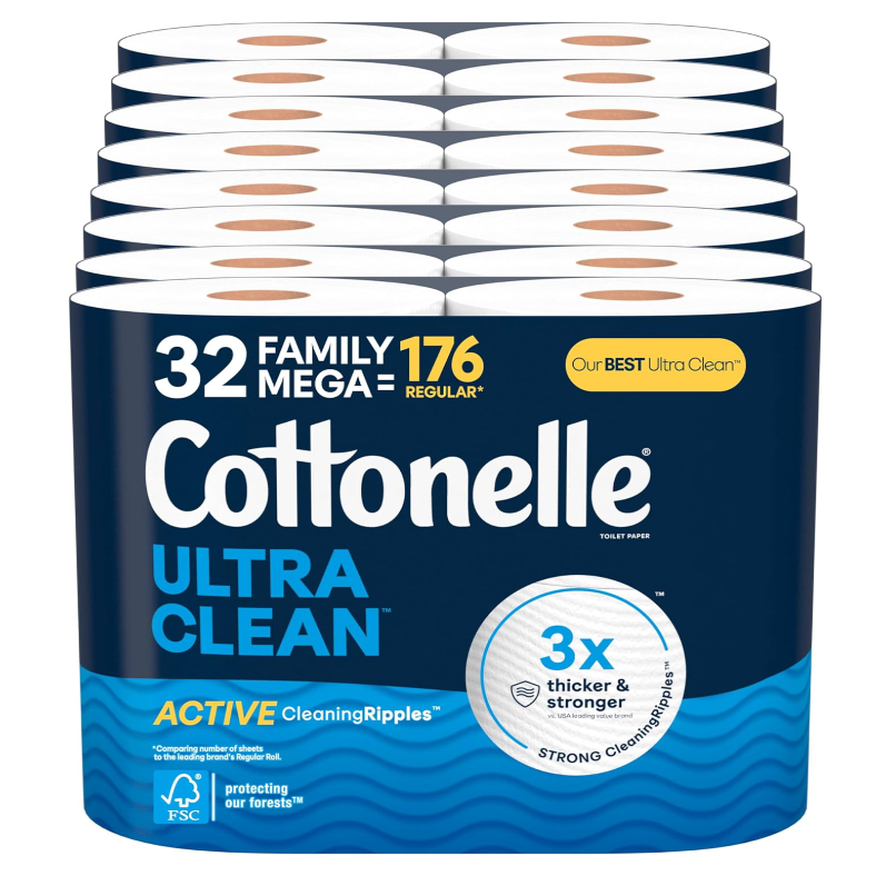 • 32 Family Mega Rolls of Cottonelle Ultra Clean Toilet Paper (8 packs of 4); 353 sheets per roll; packaging and product may vary