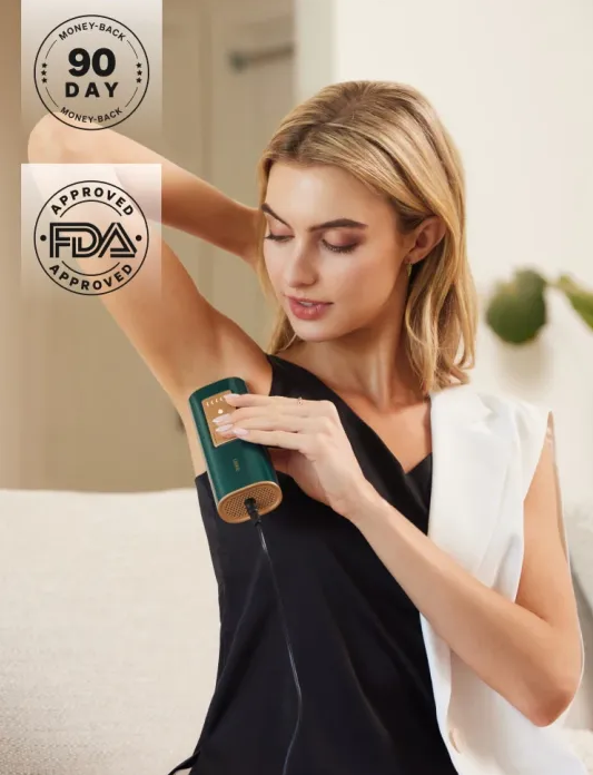 90-DAY MONEY BACK GUARANTEE 2-YEAR HASSEL-FREE WARRANTY FREE SHIPPING • Permanent Results in 4 Weeks (GUARANTEED) • 100% Painfree (Sapphire Ice-Cooling Tech) • Works on Whole Body (5 Levels) • FDA  AP